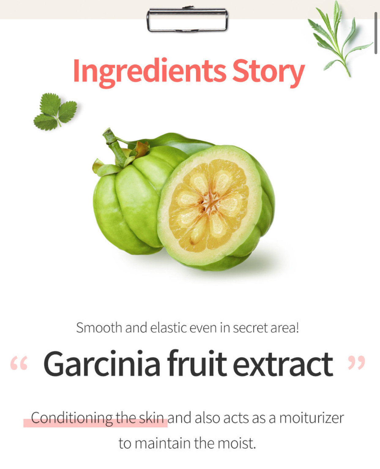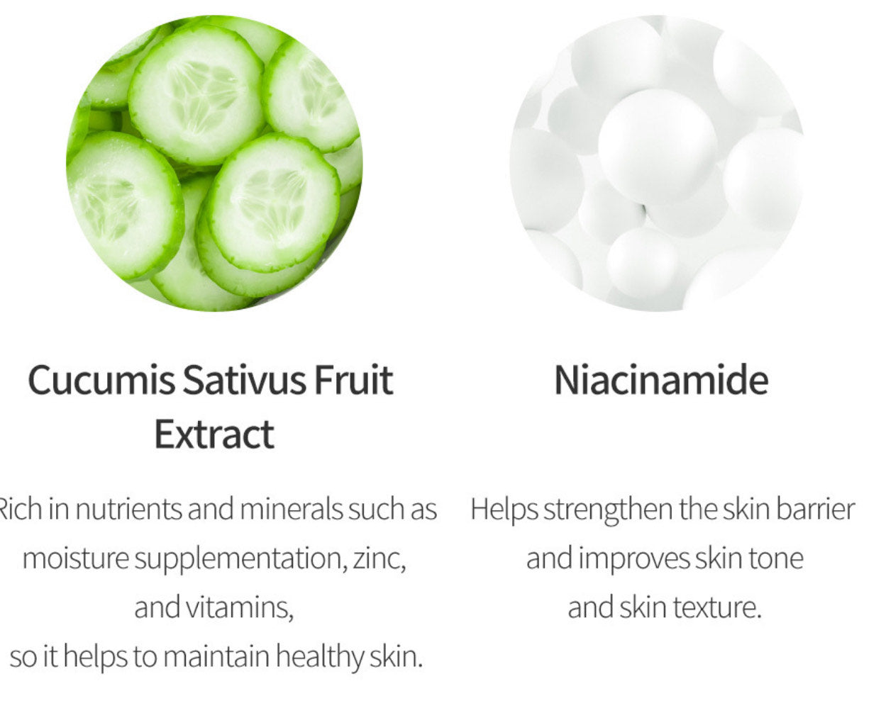 Vatten, glycerin, natriumpolyakrylat, sorbitol, ricinus communis (ricin)fröolja, trietylhexanoin, cellulosagummi, kaolin, extrakt av Anemarrhena asphodeloides-rot, niacinamid, extrakt av Piper methysticum-rot, extrakt av Garcinia cambogia-frukt, extrakt av Cucumis sativus (gurka), extrakt av Coix Lacryma-Jobi ma-yuen-frö, 1,2-hexandiol, allantoin, polyakrylsyra, vinsyra, aluminiumglycinat, dinatrium EDTA, titandioxid, butylenglykol, fenoxietanol, natriumbensoat, isopropylalkohol.